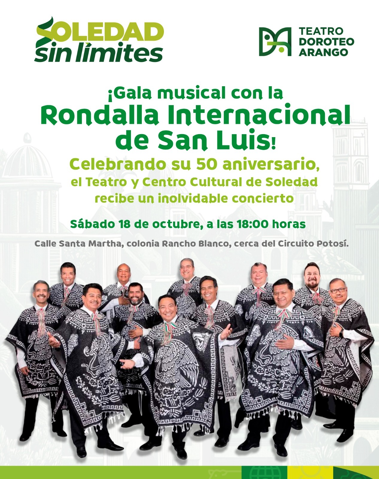 El Ayuntamiento de Soledad de Graciano Sánchez lleva la cultura y el arte al corazón de las familias, mediante el impulso del concierto de la Rondalla Internacional de San Luis, que celebra 50 años cantando al amor y dejando huella en generaciones con su estilo inconfundible; este evento de gran relevancia busca acercar a la población espectáculos de calidad, fomentar la convivencia familiar y fortalecer el orgullo por el talento local que distingue a Soledad, atendiendo la visión del Alcalde Juan Manuel Navarro Muñiz.